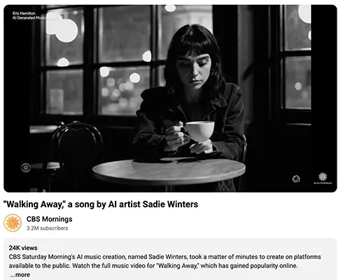 CBS’s follow-up on Sadie Winters—a fully AI-generated singer whose debut song Walking Away was created in under three minutes—highlights how quickly synthetic artists can capture real-world attention. What began as a CBS Saturday Morning experiment is now being broadcast on radio, referenced by Joe Rogan, and even inspiring fan-made videos through AI video models. While critics question whether fans will truly connect with artists who don’t exist, the speed and scale of Sadie’s rise underscore how AI is blurring the line between cultural experiment and commercial opportunity.