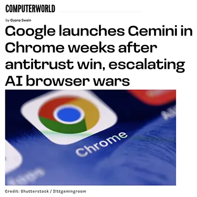 14. Computerworld — “Google launches Gemini in Chrome weeks after antitrust win” (September 19, 2025)Bundling, browser distribution, and regulatory scrutiny — the platform control story in miniature. Computerworld is not on your approved list; use for context, not primary citation. https://www.computerworld.com/article/4060120/google-launches-gemini-in-chrome-weeks-after-antitrust-win-escalating-ai-browser-wars.html