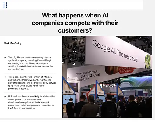 6. Brookings Institution — “What happens when AI companies compete with their customers?” (March 2026)Mary Meeker’s commoditization argument; Anthropic and OpenAI moving into application-layer revenue. Note: Brookings is not on your approved source list — confirm editorial fit before using. https://www.brookings.edu/articles/what-happens-when-ai-companies-compete-with-their-customers/