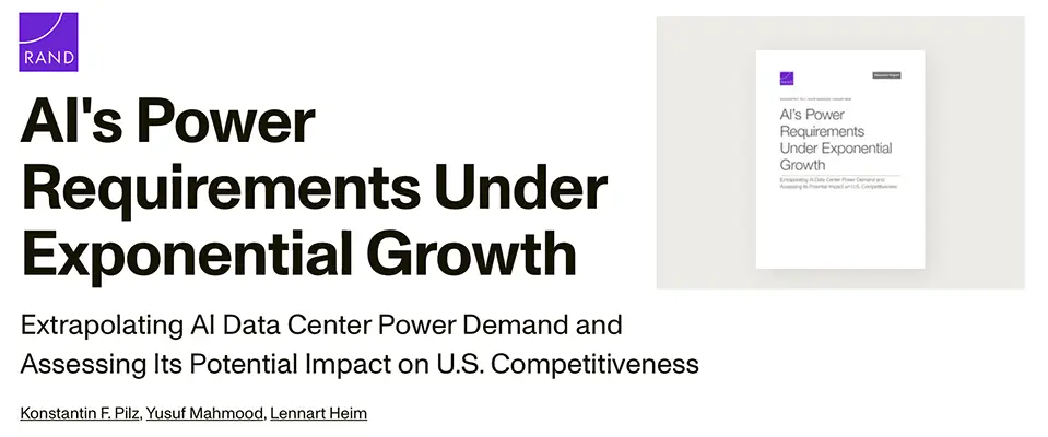 RAND Corporation — AI’s Power Requirements Under Exponential Growth (January 2025) https://www.rand.org/pubs/research_reports/RRA3572-1.html ⚠️ Use for background framing only.