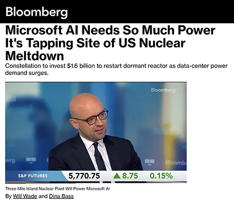 Bloomberg — Three Mile Island Nuclear Plant Will Restart to Power Microsoft AI (September 2024) https://www.bloomberg.com/news/articles/2024-09-20/microsoft-s-ai-power-needs-prompt-revival-of-three-mile-island-nuclear-plant