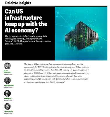 Deloitte Insights — Can U.S. Infrastructure Keep Up With the AI Economy? (December 2025) https://www.deloitte.com/us/en/insights/industry/power-and-utilities/data-center-infrastructure-artificial-intelligence.html ⚠️ Vendor/analyst report — “This analysis was produced by Deloitte and represents analyst opinion.”