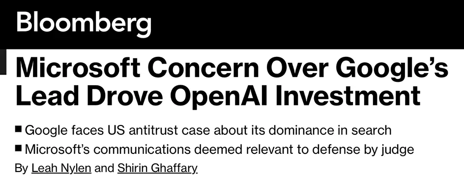 Bloomberg — Microsoft Concern About Google’s Lead Drove Investment in OpenAI (May 2024) https://www.bloomberg.com/news/articles/2024-05-01/microsoft-concern-about-google-s-lead-drove-investment-in-openai