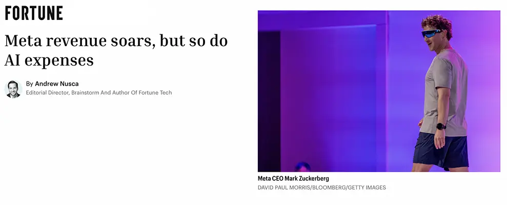 Fortune — Meta revenue soars but so do AI expenses (October 2025) https://fortune.com/2025/10/30/meta-revenue-soars-but-so-do-ai-expenses/