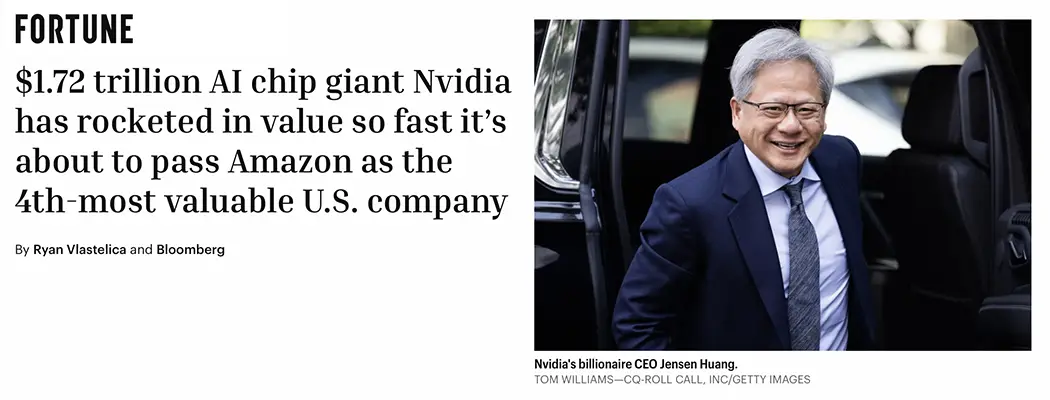 Fortune — Nvidia is about to pass Amazon as the 4th-most valuable U.S. company (February 2024) https://fortune.com/2024/02/09/how-valuable-nvidia-amazon-billionaire-jensen-huang/