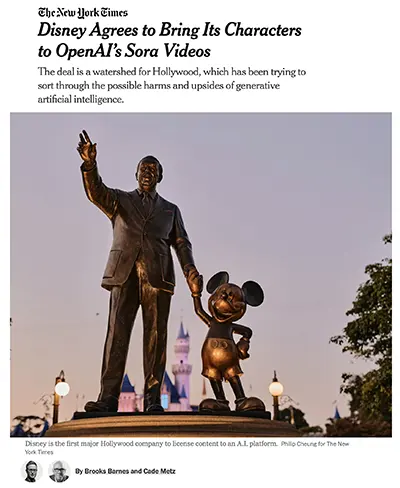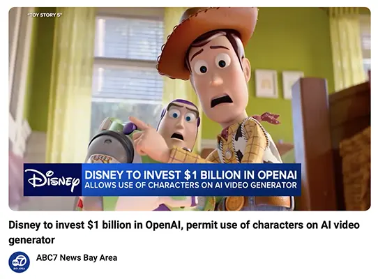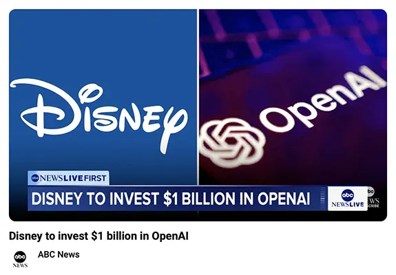 - Disney announced a three-year deal to invest $1 billion in OpenAI, allowing users to create videos featuring Disney characters on the Sora platform.