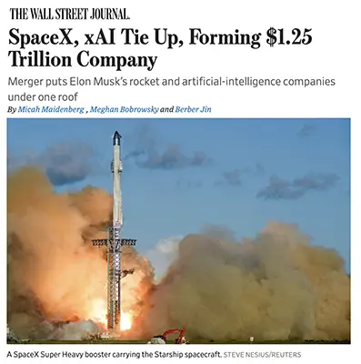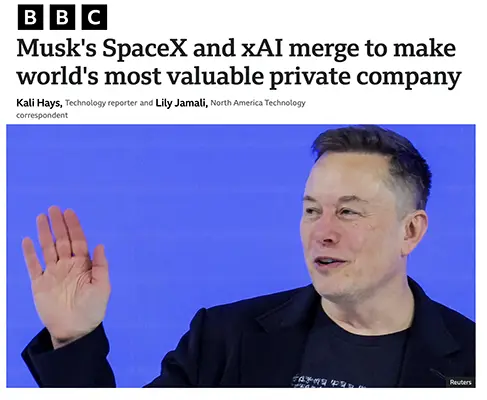 MUSK’S SPACEX AND XAI MERGE TO MAKE WORLD’S MOST VALUABLE PRIVATE COMPANY