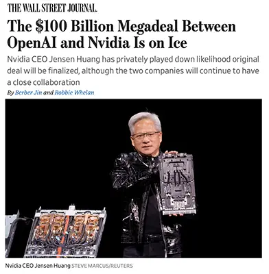 The WSJ reports that Nvidia’s plan to invest up to $100 billion in OpenAI—in exchange for building at least 10 GW of compute that OpenAI would lease—has stalled and may never be finalized. Internally, Nvidia executives have raised concerns about OpenAI’s business discipline, competitive landscape, and the scale of the commitment. CEO Jensen Huang has been privately emphasizing that the original agreement was nonbinding and recently told reporters the investment would be far less than $100 billion.