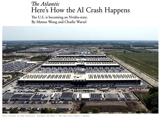 This Atlantic investigation examines how the AI boom—driven by massive investments in data centers, Nvidia chips, and power infrastructure—could evolve into a systemic economic shock. The U.S. is increasingly described as an “Nvidia-state,” where AI-related spending accounts for a disproportionate share of GDP growth and stock-market gains, even as profits lag behind capital outlays.