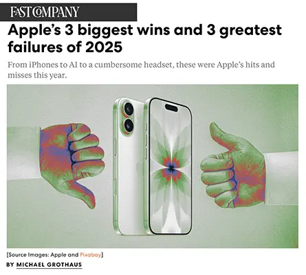 Fast Company reviews Apple’s 2025 wins and failures, with AI emerging as a notable weak spot. While Apple succeeded with hardware (iPhone 17) and design (iOS 26’s Liquid Glass), Apple Intelligence lagged competitors, delivering incremental features rather than transformative AI experiences.
