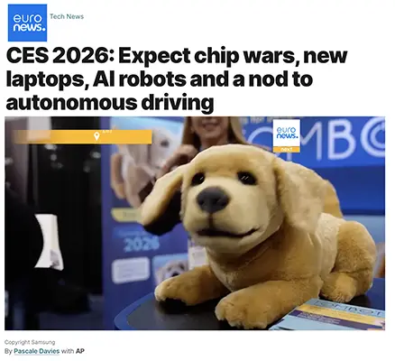 Euronews previews CES 2026 as a showcase of AI embedded everywhere: next-generation chips from Nvidia, AMD, Intel, and Qualcomm; a wave of AI-powered laptops; and growing visibility of physical AI in robots and autonomous systems.