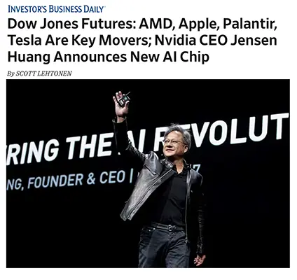 DOW JONES FUTURES: AMD, APPLE, PALANTIR, TESLA ARE KEY MOVERS; NVIDIA CEO JENSEN HUANG ANNOUNCES NEW AI CHIP
