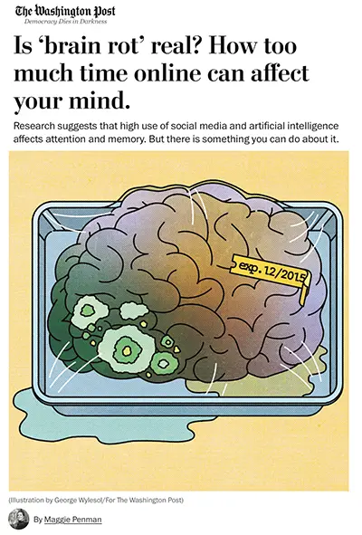 The article unpacks “brain rot,” an online term for the sense that constant scrolling is harming our minds. Experts like author Catherine Price say they hear from many people who can no longer focus long enough to read books, attributing this to smartphones and attention-fragmenting feeds. Meta-analyses find that increased short-form video use correlates with poorer cognition and higher anxiety, though causality is still being studied.