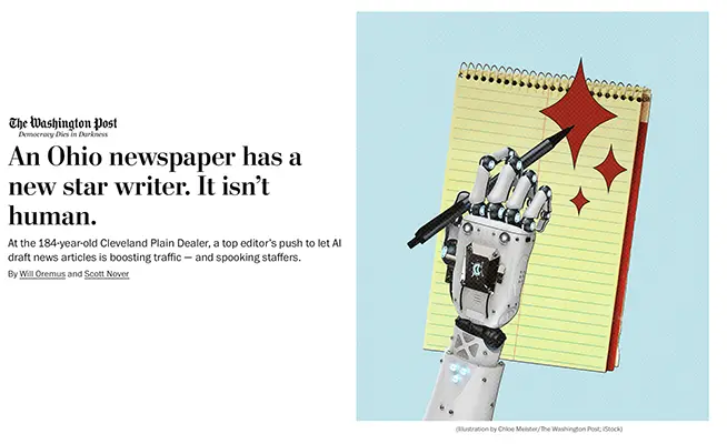 The piece uses a newsroom case (Cleveland.com) to illustrate a controversial workflow: reporters gather material, and an “AI rewrite specialist” drafts stories, reportedly freeing up an extra workday per week. Backlash frames this as “content farming,” but the author argues it’s better understood as a full separation of reporting and writing, with reporters becoming supervisors/operators of AI drafting—still responsible for accuracy and final copy.