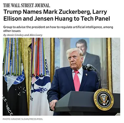 President Trump has appointed 13 technology industry leaders โ including Meta CEO Mark Zuckerberg, Oracle’s Larry Ellison, Nvidia’s Jensen Huang, Google co-founder Sergey Brin, and Dell’s Michael Dell โ to the President’s Council of Advisors on Science and Technology (PCAST). The council, which may expand to 24 members, will be co-chaired by David Sacks (White House AI and crypto czar) and adviser Michael Kratsios. Its stated mandate: advise the administration on AI regulation and emerging technology policy.