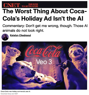 CNET offered a more balanced view, arguing that while the ad’s visuals were undeniably AI-generated “slop”, the real issue lies in normalizing AI without reflection. Reporter Katelyn Chedraoui noted that Coca-Cola’s open disclosure (“Created by Real Magic AI”) was at least a step toward AI transparency, something other brands often avoid. The article placed the Coke controversy within a broader trend: a surge of AI-generated ads from companies like Google, Vogue, and Toys R Us, as creative automation rapidly expands across industries.