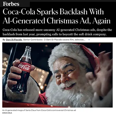 https://www.forbes.com/sites/danidiplacido/2025/11/04/coca-cola-sparks-backlash-with-ai-generated-christmas-ad-again/: November 11, 2025