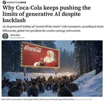 Coca-Cola’s 2025 holiday campaign has reignited debate about AI in creative industries, marking the second consecutive year the brand has leaned heavily on generative AI to produce its “Holidays Are Coming” ads. According to Marketing Dive, Coca-Cola views its AI-generated work as a success story, claiming the commercial “scored off the charts” in audience metrics and brand association. Executives like Islam ElDessouky defended the campaign as part of a broader “AI-powered creative strategy,” emphasizing innovation, global personalization, and the integration of cultural assets like the brand’s iconic Santa and Christmas trucks.
