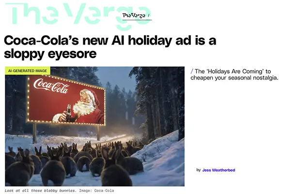 • Coca-Cola’s 2025 AI holiday ad triggers fresh backlash over quality/consistency, underscoring brand risk when generative video misses the mark—even if cheaper/faster. (The Verge)