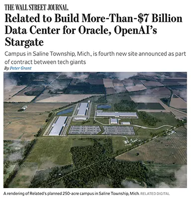 Real-estate giant Related Companies will construct a $7+ billion data-center campus in Saline Township, Michigan, as part of Oracle and OpenAI’s Stargate project—a multi-trillion-dollar plan to expand global AI compute capacity. The Michigan site will deliver over one gigawatt of power, making it one of the world’s largest AI data centers.