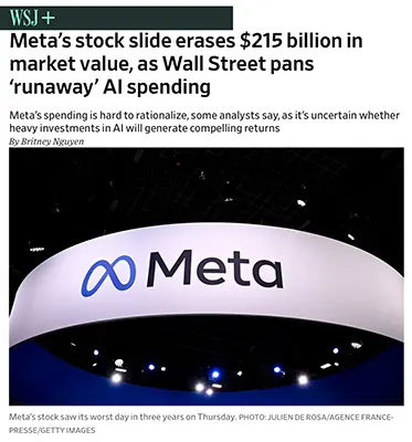 📉 Meta’s Stock Slide Erases $215 Billion in Market Value as Wall Street Pans ‘Runaway’ AI Spending