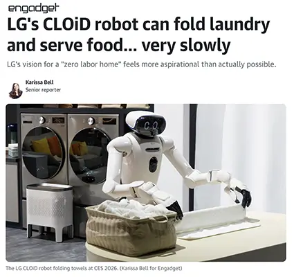 At CES 2026LG showcased CLOiD (pronounced like Floyd), a humanoid robot capable of folding laundry, serving food, and performing household tasks—albeit slowly and under carefully staged conditions. The demo reinforced a familiar CES pattern: impressive technical feats that remain far from scalable, affordable, or practical deployment.